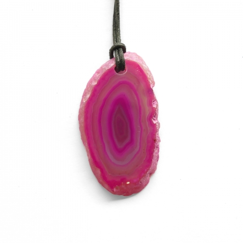 Bei diesem Artikel handelt es sich um eine beidseitig polierte Achatscheiben mit einer Länge von ca. 4-7 cm mit extragroßer Lochbohrung. Der Achat ist pink gefärbt. Im Lieferumfang weiters enthalten ist ein 42 cm langes schwarzes Ziegenlederband mit Verschluss in der Stärke 15 mm. Getragen um den Hals ein wahrer Blickfang. Da es sich bei den verarbeiteten Steinen um ein Naturprodukt handelt können Farben, Form und Musterung vom Beispielbild abweichen. Verbraucherhinweis: Bitte bedenken Sie, dass alle beschriebenen Wirkungen wissenschaftlich nicht belegbar sind und daher keinen Besuch beim Arzt ersetzen.