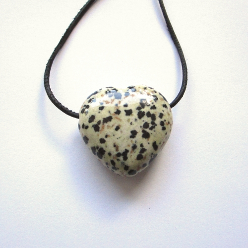 Bei diesem Artikel handelt es sich um einen Lochstein in Herzform aus Dalmatiner Jaspis mit den Maßen 30x30x15 mm. Im Lieferumfang weiters enthalten ist ein 42 cm langes schwarzes Ziegenlederband mit Verschluss in der Stärke 15 mm. Da es sich bei den verarbeiteten Steinen um ein Naturprodukt handelt können Farben, Form und Musterung vom Beispielbild abweichen. Verbraucherhinweis: Bitte bedenken Sie, dass alle beschriebenen Wirkungen wissenschaftlich nicht belegbar sind und daher keinen Besuch beim Arzt ersetzen.